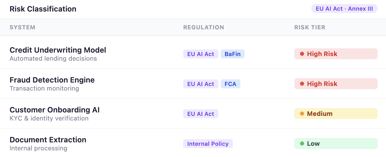 AI governance and compliance for financial institutions. Manage AI risk, meet EU AI Act requirements, and stay audit-ready — without adding headcount.