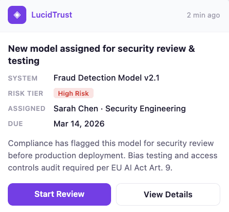 LucidTrust brings Legal, Compliance, Security, Privacy, IT, and ML teams into one system — so nothing falls through the cracks and everyone has the context they need.