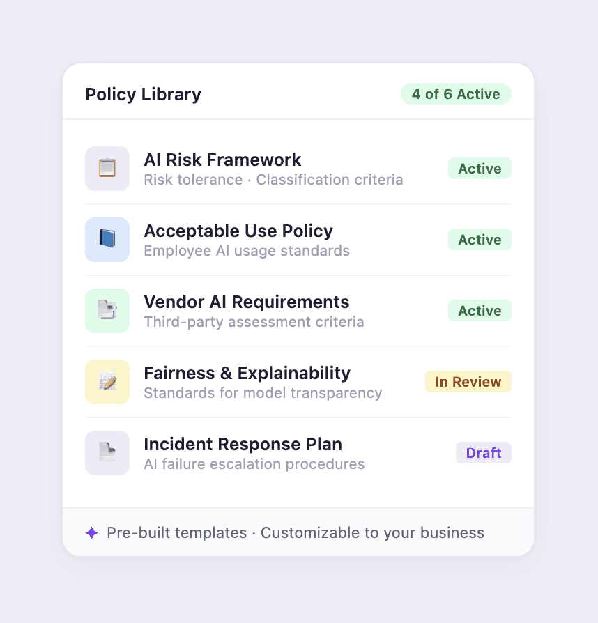 Purpose-built capabilities that let lean teams stand up a defensible AI governance program — without adding headcount or stitching together generic tools.
