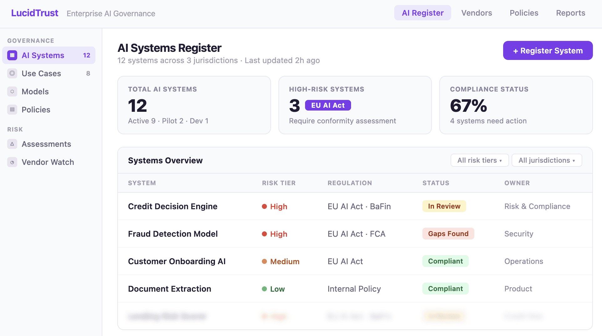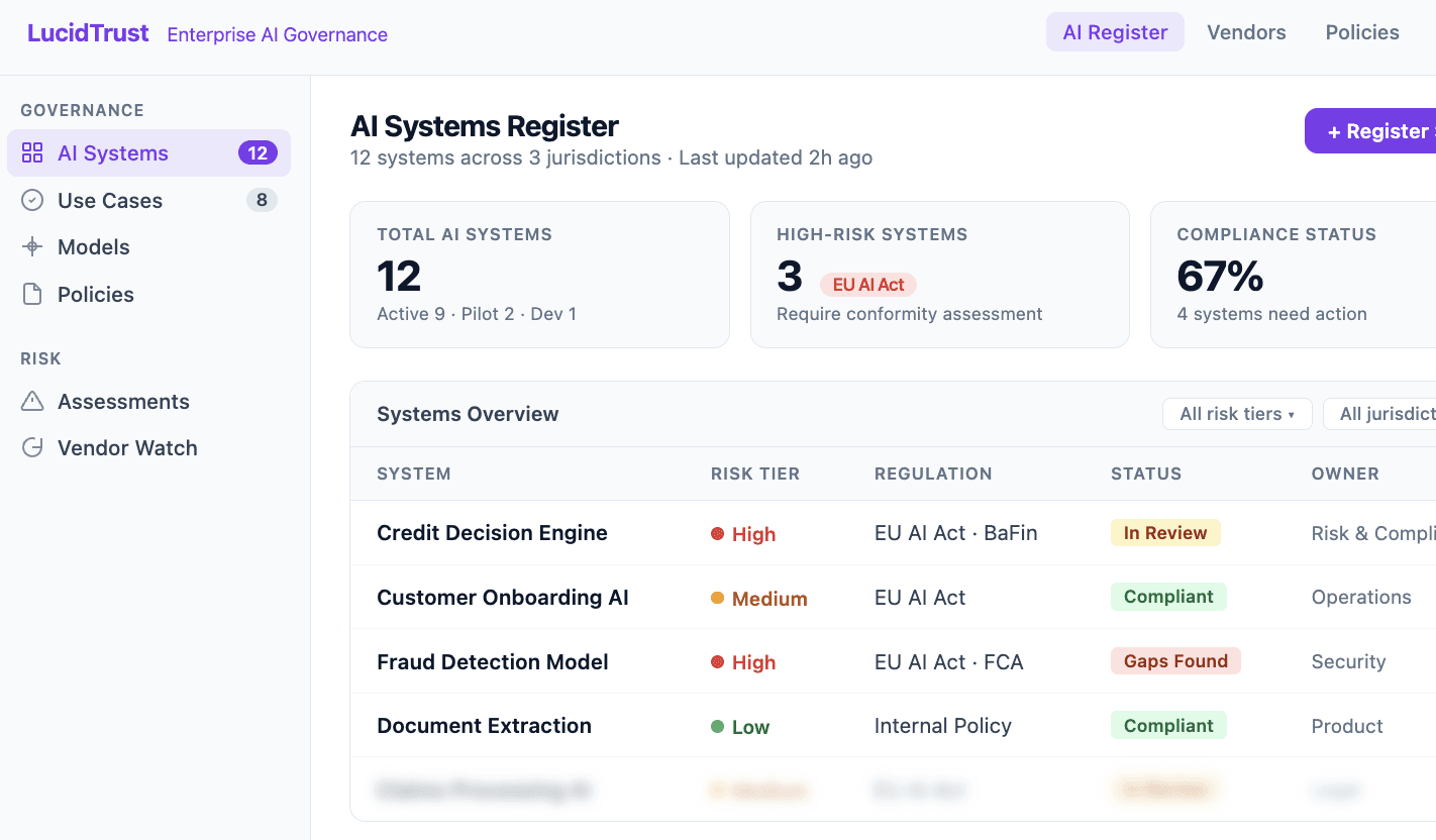 High-risk classification, conformity assessments, and documentation requirements — mapped to your AI inventory automatically. Whether you're navigating EU AI Act, BaFin oversight in Germany, FCA requirements in the UK, or building a defensible program in the US, LucidTrust adapts to your regulatory landscape.