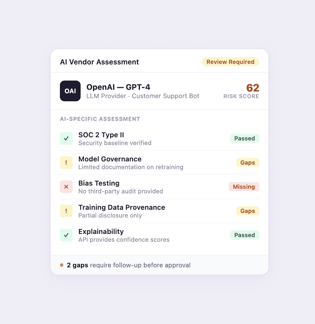Your vendors are shipping AI features faster than your team can evaluate them. LucidTrust assesses what regulators actually care about — model governance, bias testing, training data provenance, and explainability — not just whether they passed a SOC 2.