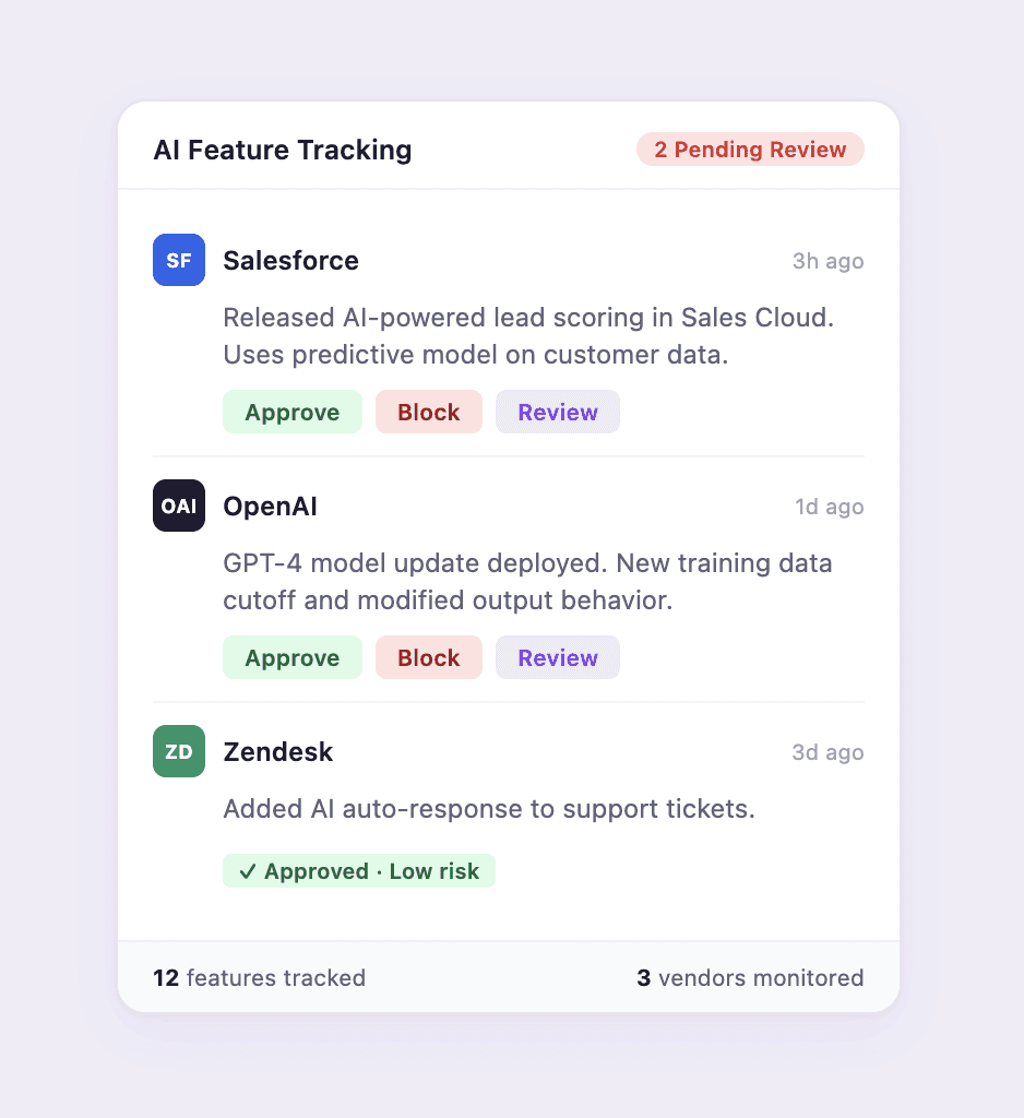 Get alerted when vendors ship new AI features, risk profiles change, or compliance gaps emerge.