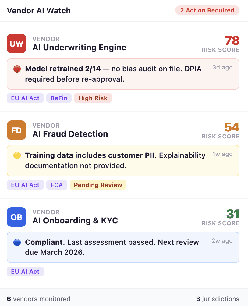 AI models aren't static. Your credit underwriting vendor, your fraud detection engine, your KYC provider — they retrain models regularly. New training data goes in, new decision logic comes out.